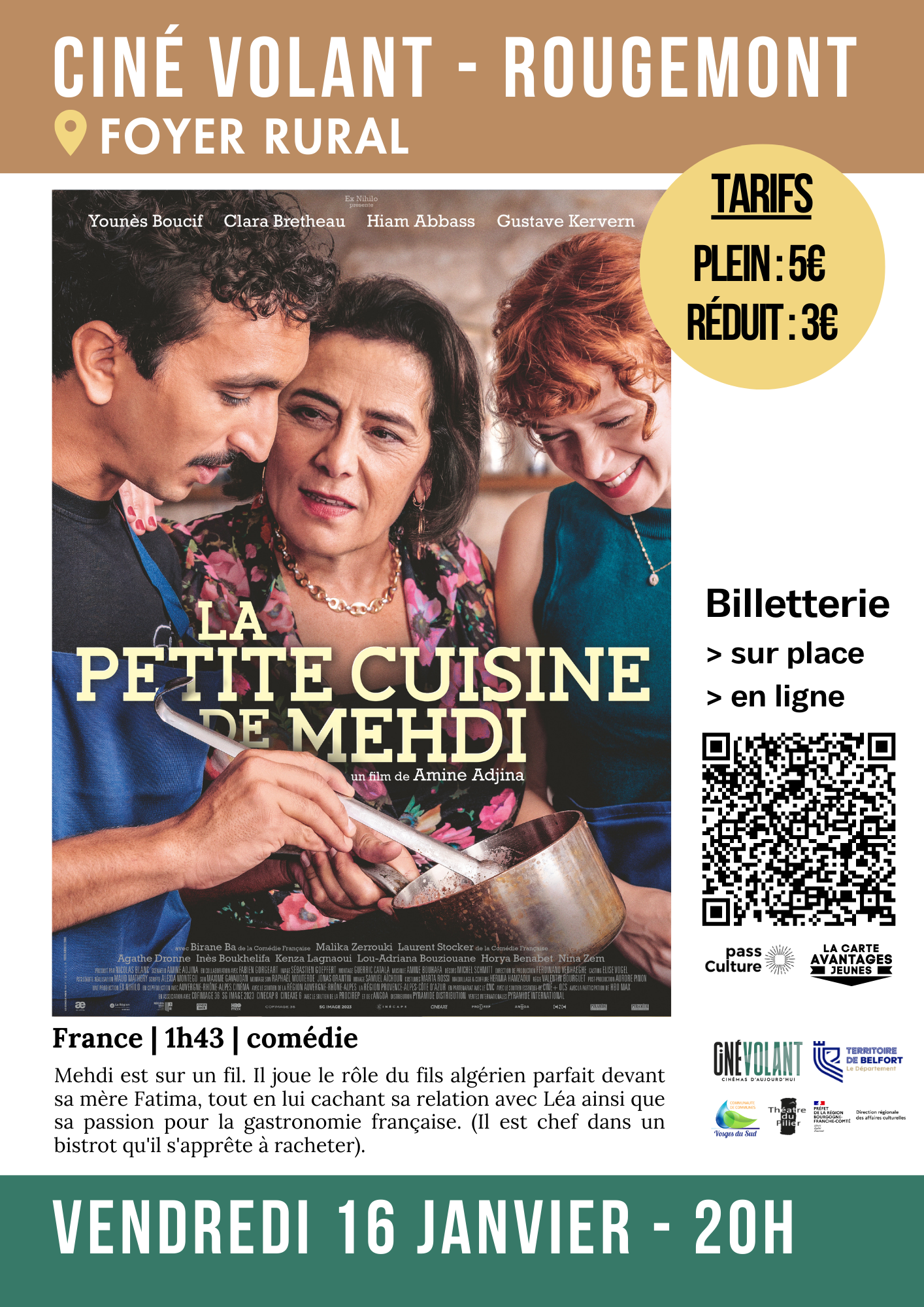 📌Vendredi 16 janvier 2026 à 20h au Foyer Rural 🎞Projection du film "La petite cuisine de Mehdi" de Amine ADJINA (comédie) par l'association Cinémas d'Aujourd'hui ✅Billetterie en ligne ou sur place >5 € (pour tous) >3 € (réduit)